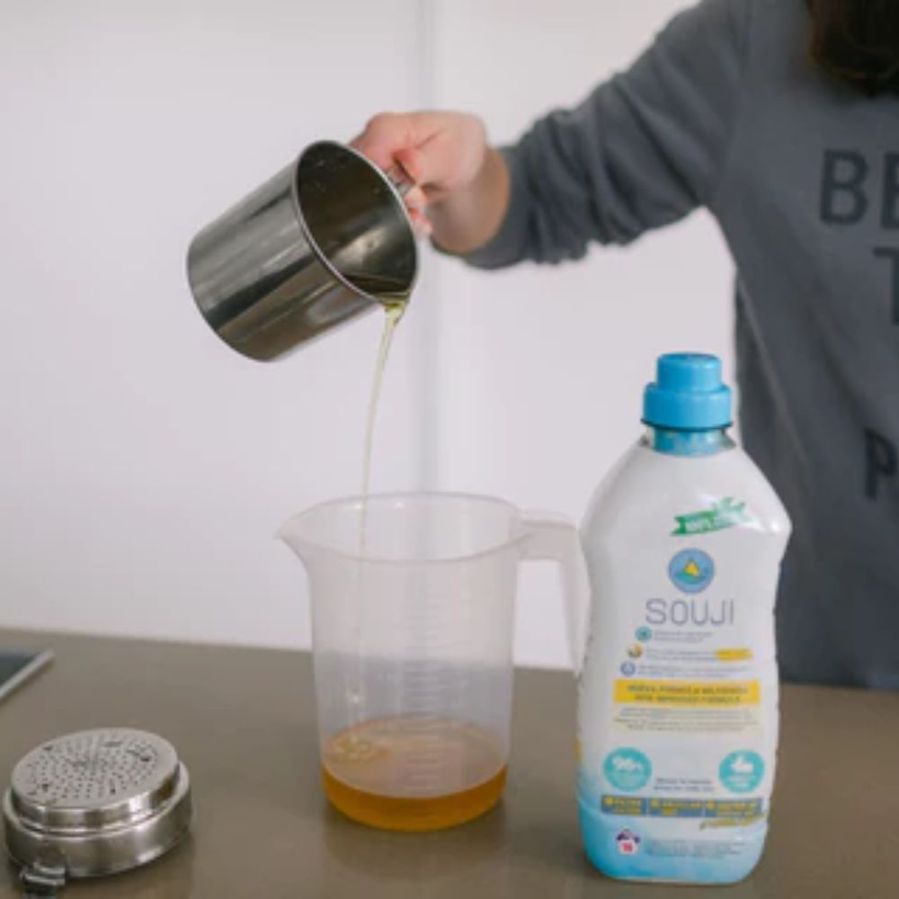 Mide las proporciones correctas de aceite usado (previamente filtrado) y SOUJI (según las instrucciones de cada envase)