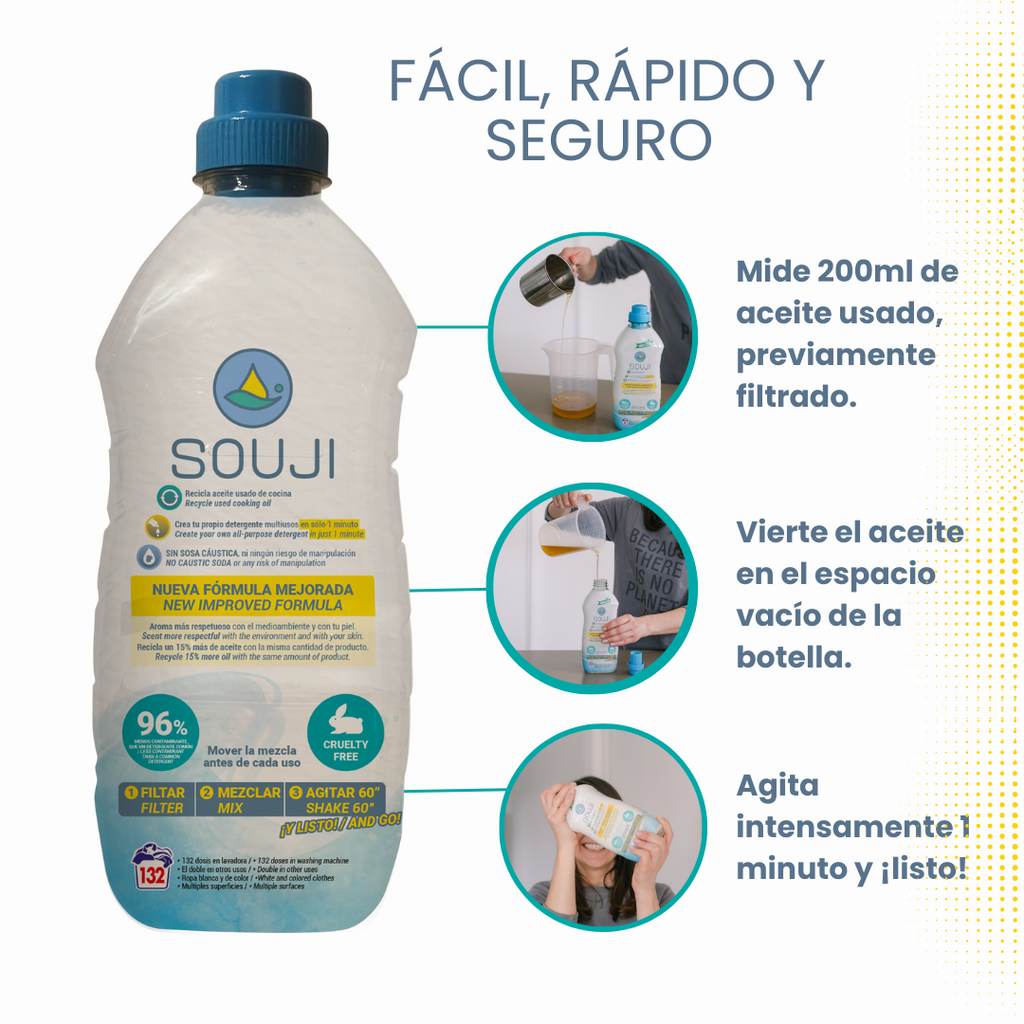 SOUJI es el método más fácil, seguro y rápido de conseguir gestionar el residuo de aceite de cocina en casa, para darle una segunda vida como producto útil de limpieza, para la ropa, la vajilla y el suelo.