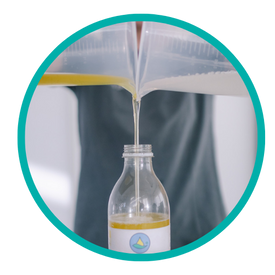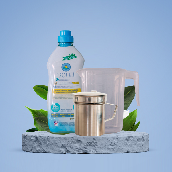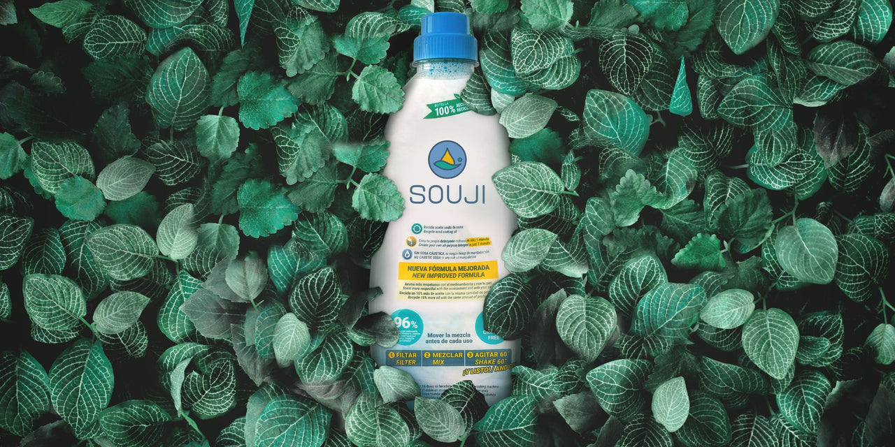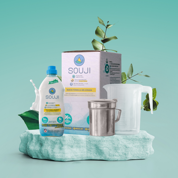 SOUJI es una formulación química realizada a base de compuestos de origen vegetal y mineral, que al mezclarse con aceite usado de cocina y agitarse 1 minuto, se transforma de inmediato en limpiador multiusos y ecológico.